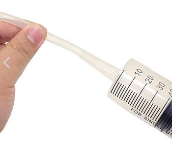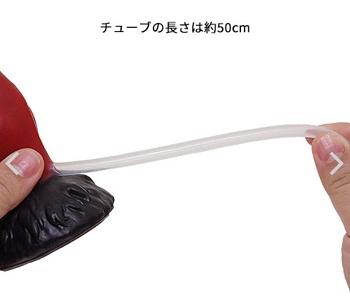 チューブにはシリンジを接続することで、液体の注入や発射、ローション補充が可能。写真で使用しているのはデラックス・プラスチック・シリンジ。アナル浣腸につかうプラスティック系のシリンジが使いやすいでしょう。