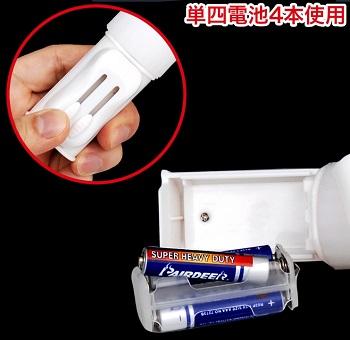 電源は単四電池×4本(付属) お馴染み、電池ボックス式(※必ず表裏計4つお入れ下さい)。 操作のダイヤルは左:スイング 右:頭部バイブレーション