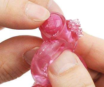 「マルチ電動ペニスリング」の突起付きの下部のリングは玉ちゃん用。 玉ちゃん固定でより鋭敏に。挿入後に激しくピストンしても抜けにくくずれにくいでしょう。