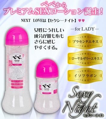 ペペシリーズはポリアク系のローションですが、こちらの“セクシーナイト”は、美肌成分として有名なプラセンタエキスやイソフラボン、ローヤルゼリーエキスを配合をプラスした、女性向けのアンチエイジング対応ローションです。